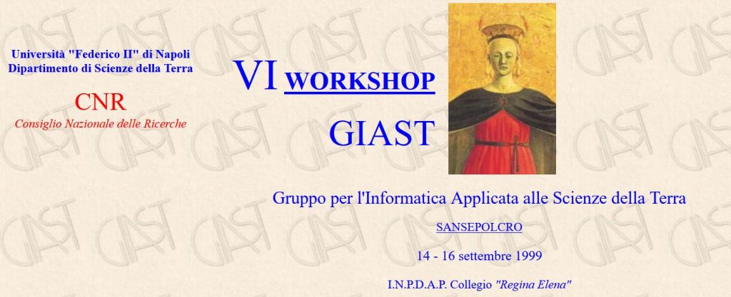 Fino al 1999 il gruppo GIAST – Gruppo di Informatica Applicata alle Scienze della Terra, si ritrovava annualmente a Sansepolcro (Ar) per il suo convegno annuale. L’ultima riunione risale al settembre del 1999. Le tematiche trattate erano veramente interessanti. Solo per fare un esempio, durante l’ultimo Convegno del 1999, le sessioni scientifiche spaziavano dalla raccolta e organizzazione dei dati per la cartografia geologica all’analisi di immagini, dall’integrazione di basi di dati all’informatica e modellizzazione geologica, dall’analisi statistica di dati applicata alle Scienze della Terra ai modelli previsionali nelle Scienze Ambientali per concludere con i sistemi esperti e intelligenza artificiale. Non da meno, le tavole rotonde riguardavano l’inserimento dell’insegnamento della Geoinformatica nel Corso di Laurea in Scienze Geologiche, i problemi dell’informatizzazione della nuova Carta Geologica d’Italia e le nuove frontiere dell’Informatica Applicata alle Scienze della Terra. Perché i lavori si siano definitivamente chiusi nel 1999 resta un mistero; l’unica ipotesi è che gli argomenti fossero per i più (ma non per i partecipanti al GIAST) davvero troppo innovativi per il tempo, pensando (erroneamente) che il passaggio dalla carta al digitale fosse aldilà da venire. All’ultimo convegno erano presenti, ma sconosciuti uno all’altro, anche il giovane Mauro De Donatis e Simone Sterlacchini (i fondatori e futuri coordinatori della Sezione GIT).